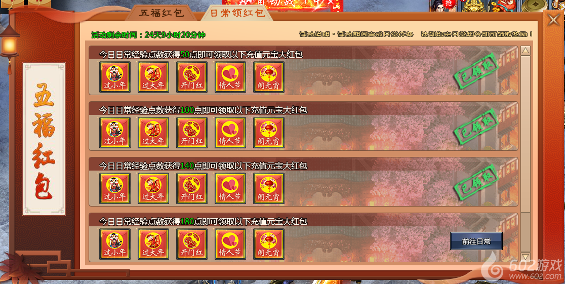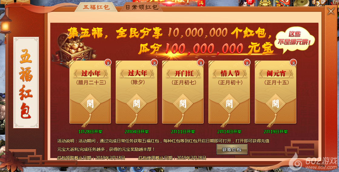 活动说明:活动期间,玩家只要上线完成日常任务,即可去五福红包活动页面领取5种五福红包,每种红包的开启日期不同,只要达到了红包开启日期,玩家就可打开红包,获得充值元宝大返利!瓜分100,000,00充值元宝!并且游戏将不定期给在线玩家发送幸运五福红包奖励邮件,免费获得大量五福红包!